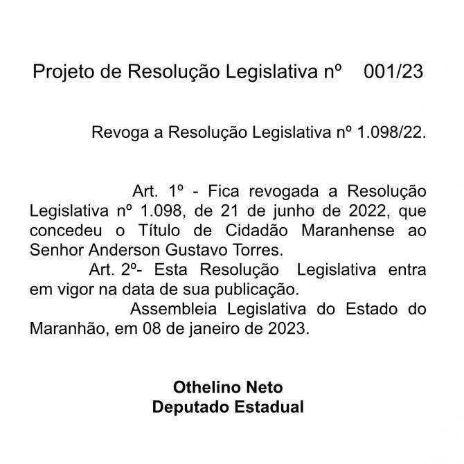 O presidente da Assembleia Legislativa do Maranhão, deputado Othelino Neto (PCdoB), protocolou, na noite deste domingo (8), o Projeto de Resolução Legislativa 001/23, revogando a Resolução Legislativa 1.098/22, que concedeu o Título de Cidadão Maranhense a Anderson Torres, ex-secretário de Segurança Pública do Distrito Federal e ex-ministro da Justiça do governo Bolsonaro.